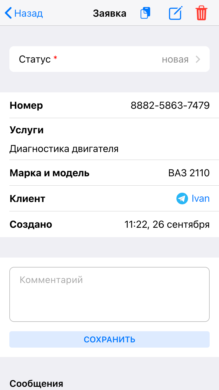 • Общение внутри заявки / диалог бизнеса с клиентом.