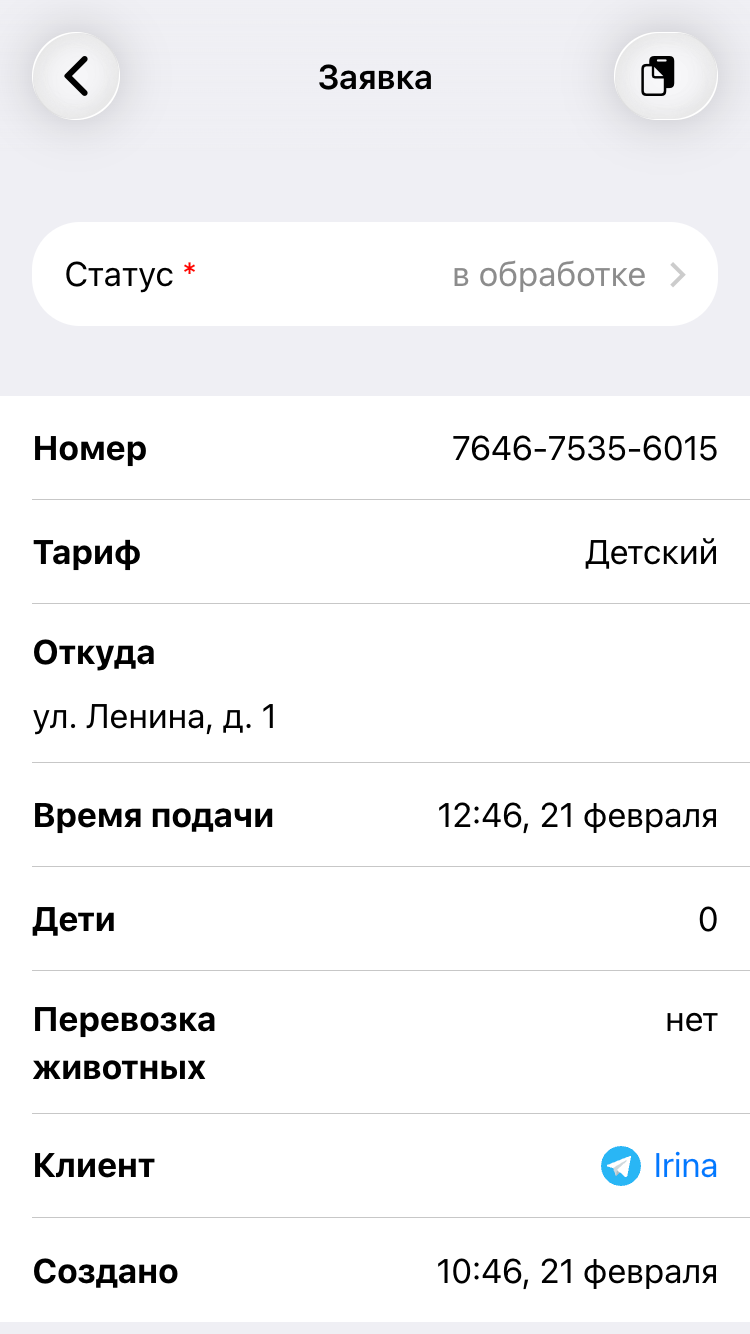 Информация о заказе, смена статуса, назначение водителя, внутренний комментарий (не виден клиенту), копирование заказа текстом и возможность редактирования.